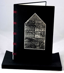 11.25 x 8.75"; 44 pages. Collagraph prints. Materials: Graphic Chemical Black 514 ink; Rives HW White 175 gm paper; Mohawk Superfine Text paper; 4- and 2-ply Conservacare Board; Canapetta Linen Book Cloth; 4-ply Linen Thread; Lineco NpH Binding Adhesive; Methyl Cellulose Paste Grade A-4-CP. Text photocopied using Xerox 1065. Bound in black cloth-covered boards with collaborative collograph inset. In matching cloth-covered slipcase.