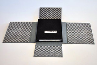 8 x 11.25"; 40 pages. Accordion fold extending from back pastedown. Intaglio and solarized images. Materials: graphic chemical Black 514 ink; Somerset Velvet Radient White (250 gm/m2) paper; linen hinging tape; paste paper; acid free 3M conservation and preservation double-coated tape; acid and lignin free binders' board; Cialinen Italian book cloth; Jade #403 PVA adhesive; Methyl celluose paste; 7 ply Irish waxed linen thread; Wausau Exact acid free paper. Bound in trifold cloth covered boards. Housed in cloth-covered pop up case with paper title on spine. Numbered.