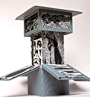 14" x 9" closed structure with four books forming the four middle sides of the tower. Two booklets – "Notes on the Tower Book" by Beth Thielen and Colophon – inside the middle section of the tower. Prints on Arches Text Wove 120 gr in Daniel Smith Domestic Velvet Black AC63. Text in Times New Roman printed on an Epson Stylus CX4600 on Neenah Classic Crest, Solar White 24 lbs acid free papers. Bound in Gray Canapetta Italian Book Cloth over acid free, Lignin free Binder’s Board. Jade 403 PVA, methyl cellulose paste, Black Arches cover, Canson Mi-Teintes Steel gray, Pearl, Barbour’s Irish Linen Thread. Linoleum prints. Numbered on the colophon.