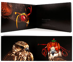“My work published in 2020, Widening Circles, explores a new subject for me- an aspect of darkness. Ferocious hawks in the wild become the symbol of the predatory instincts in both man and nature, while domesticated hawks are masked and leashed. “Written over 100 years ago, in a time of extreme duress, the text from a poem by Rilke is embossed in a deep, deep black photographic paper. You have to really lean into the text to read it, to find the message of hope that counterbalances any violence implied in both the hawk on the hunt and the hawk in captivity.