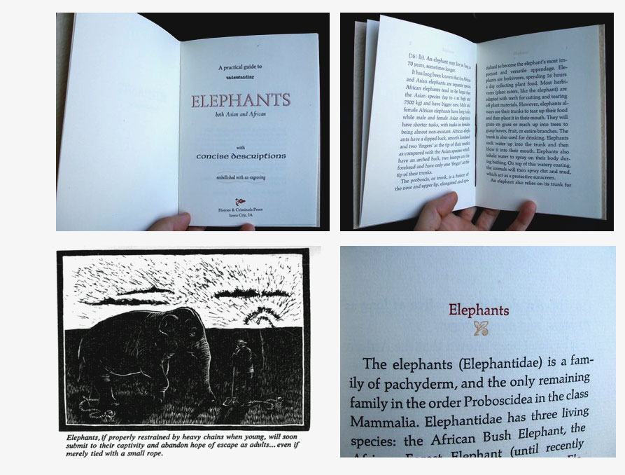 A chapbook about elephants, with original wood engraving. Text derived from Wikipedia, "copyleft 2007."